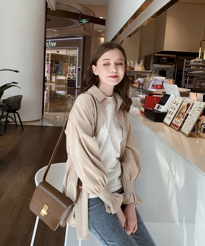 米色長(zhǎng)袖蝴蝶袖口燈芯絨襯衫