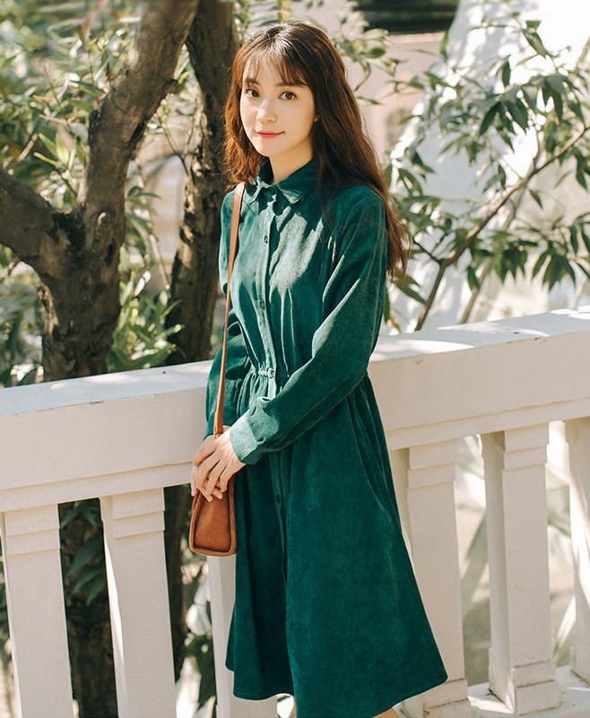 淺藍(lán)立領(lǐng)燈芯絨襯衫搭配燈芯絨A字裙