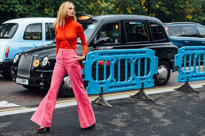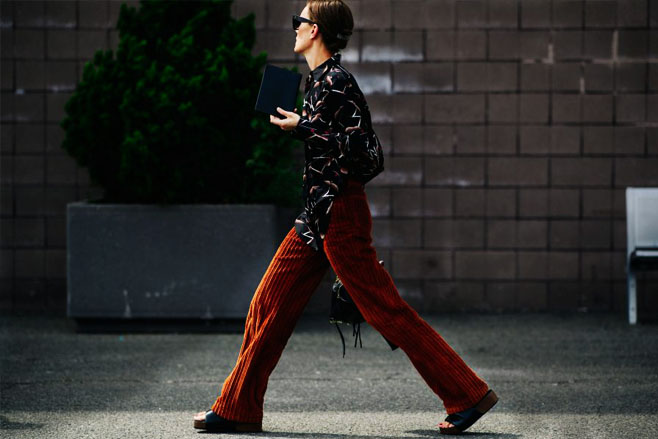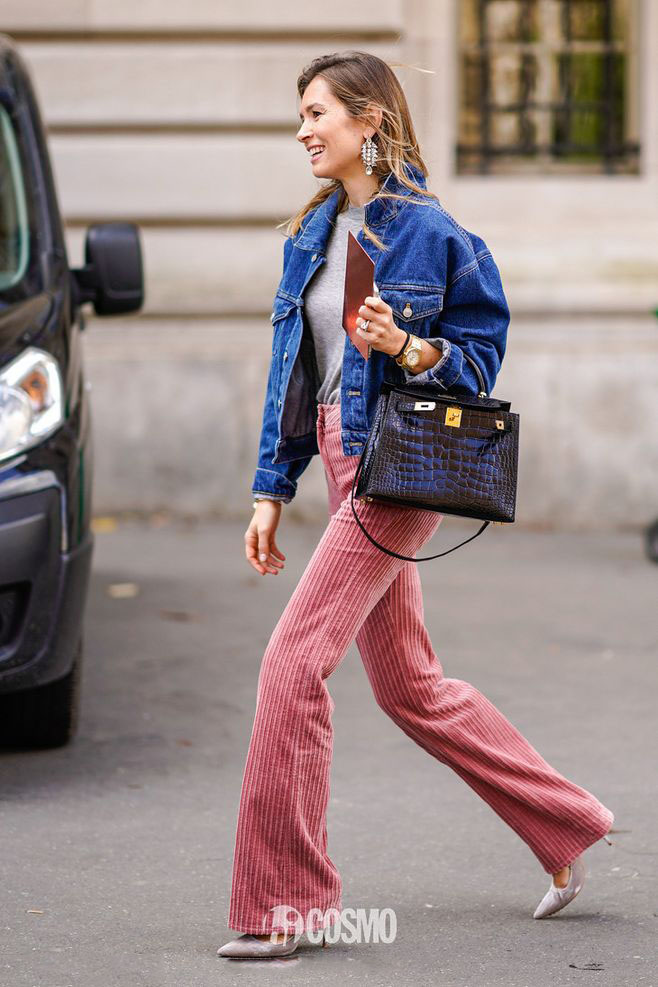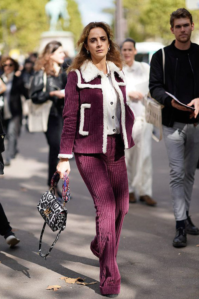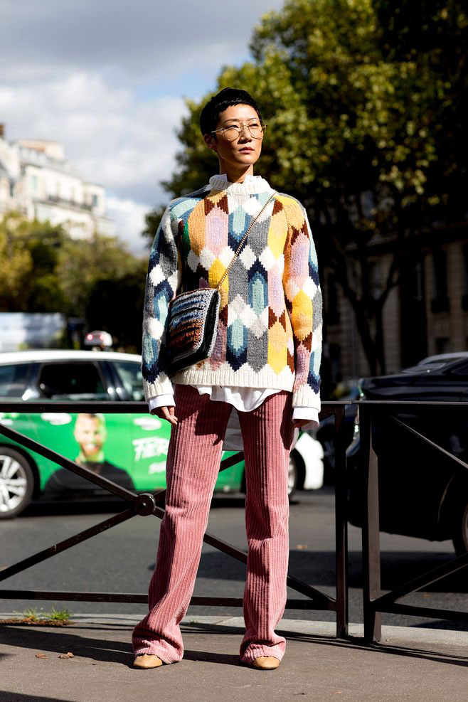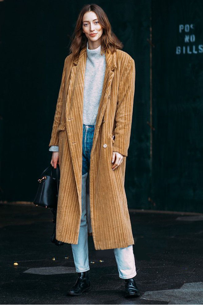 燈芯絨面料,條數(shù)越少,條絨就越粗。一般4.5條以下的燈芯絨都算是粗條燈芯絨,粗條燈芯絨,因條絨較粗曠,厚實飽滿,一般粗條燈芯絨面料都是做家紡的用途較多。如:抱枕、靠墊、沙發(fā)椅套等,其實粗條燈芯絨在時尚界也是大放異彩,特別深受歐美國家消費(fèi)者的喜好,下面我們來看看時尚街拍: