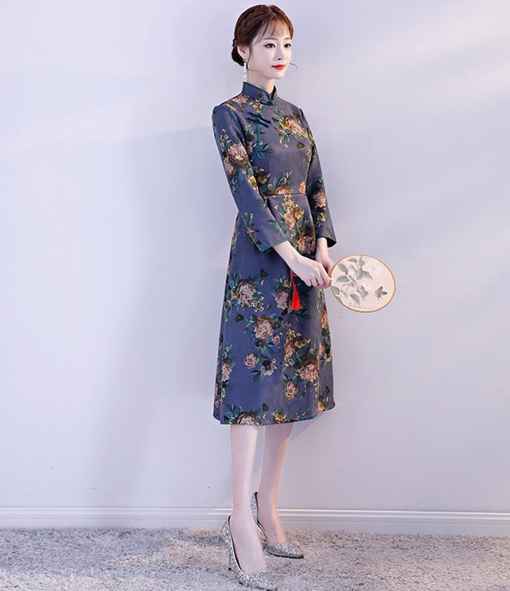 數(shù)碼印花相比傳統(tǒng)轉(zhuǎn)移印花,降低了制版成本,提高了效率,降低了對環(huán)境的污染!制版花輥需要電鍍,而電鍍行業(yè)是鉻重金屬污染的主要來源!數(shù)碼印花可以直接省略了這一步。任何花型,顏色都可以通過數(shù)碼打印出來,再轉(zhuǎn)印到面料上。數(shù)碼印花給了麂皮絨更大的拓展空間!空氣層麂皮絨的挺括,透氣,保暖性能跟一些傳統(tǒng)的花型,艷麗的顏色相結(jié)合,再經(jīng)設(shè)計師之手,一件件舒適,精致,高雅的旗袍應(yīng)運(yùn)而生,東方女性之美盡顯無遺!下面我們來欣賞下麂皮絨旗袍之美!