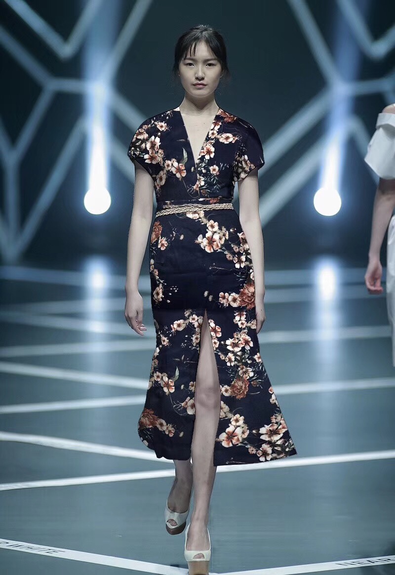 牡丹花-印花空氣層麂皮絨連衣裙-時(shí)尚秀場