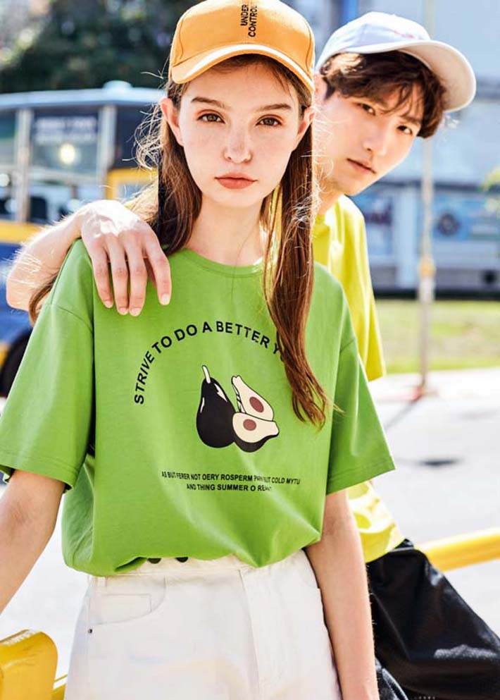 牛油果綠T恤搭配白色牛仔褲。簡(jiǎn)單,清爽,富有活力!