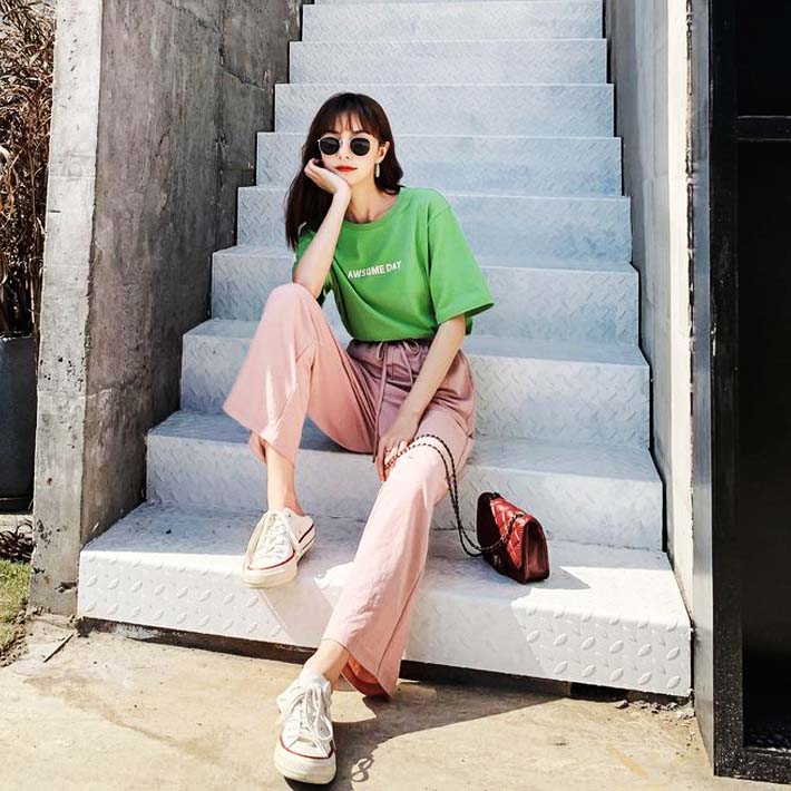 這個(gè)牛油果綠T恤搭配闊腿褲簡(jiǎn)直是美爆了。闊腿褲可以拉長(zhǎng)身材比例,讓自己看起來(lái)又高又瘦,再搭配上板鞋,屬于比較休閑的風(fēng)格。
