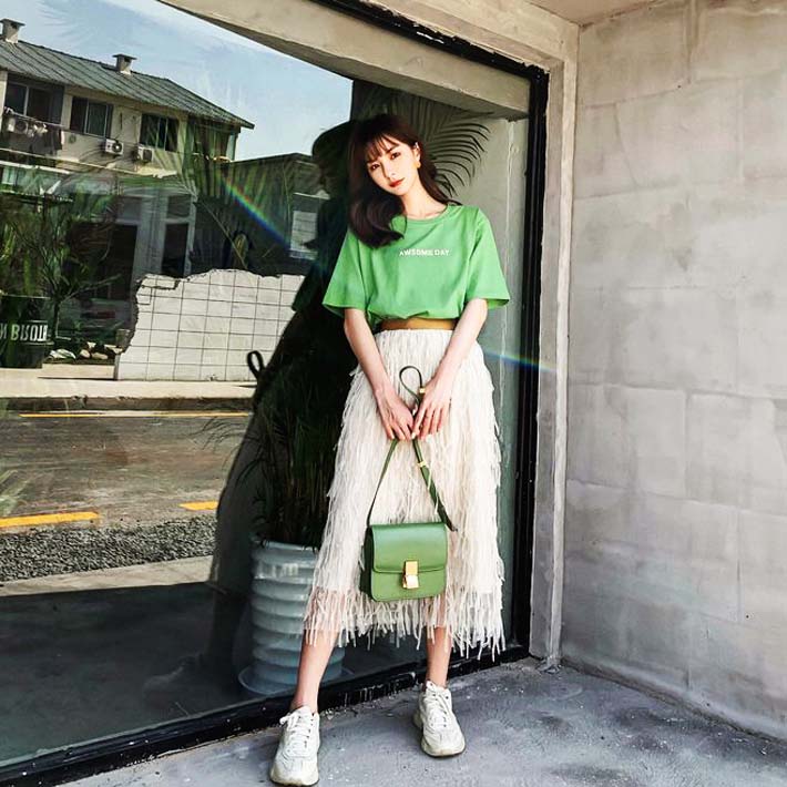 牛油果綠T恤搭配白色長(zhǎng)裙。