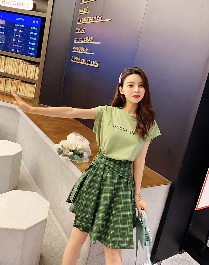 牛油果綠T恤搭配綠色格子A字裙