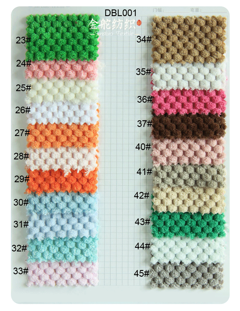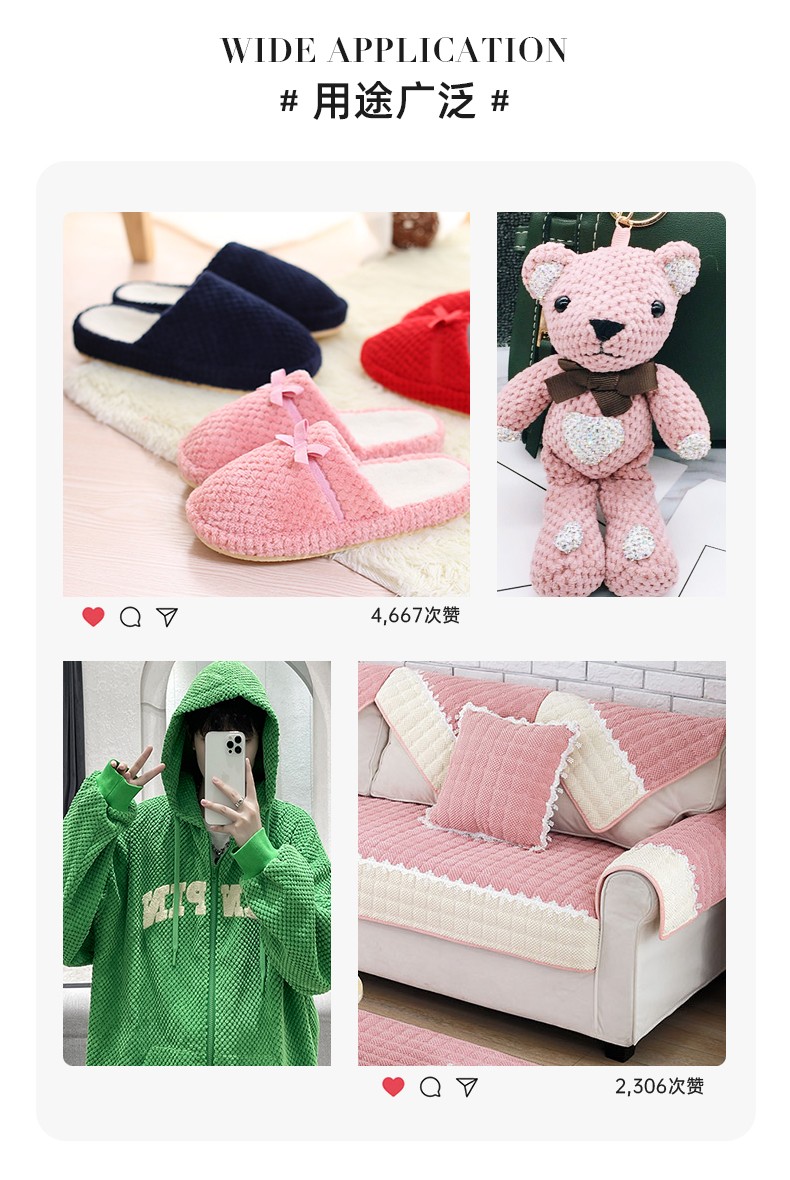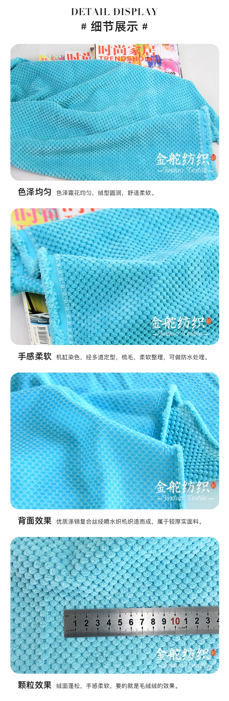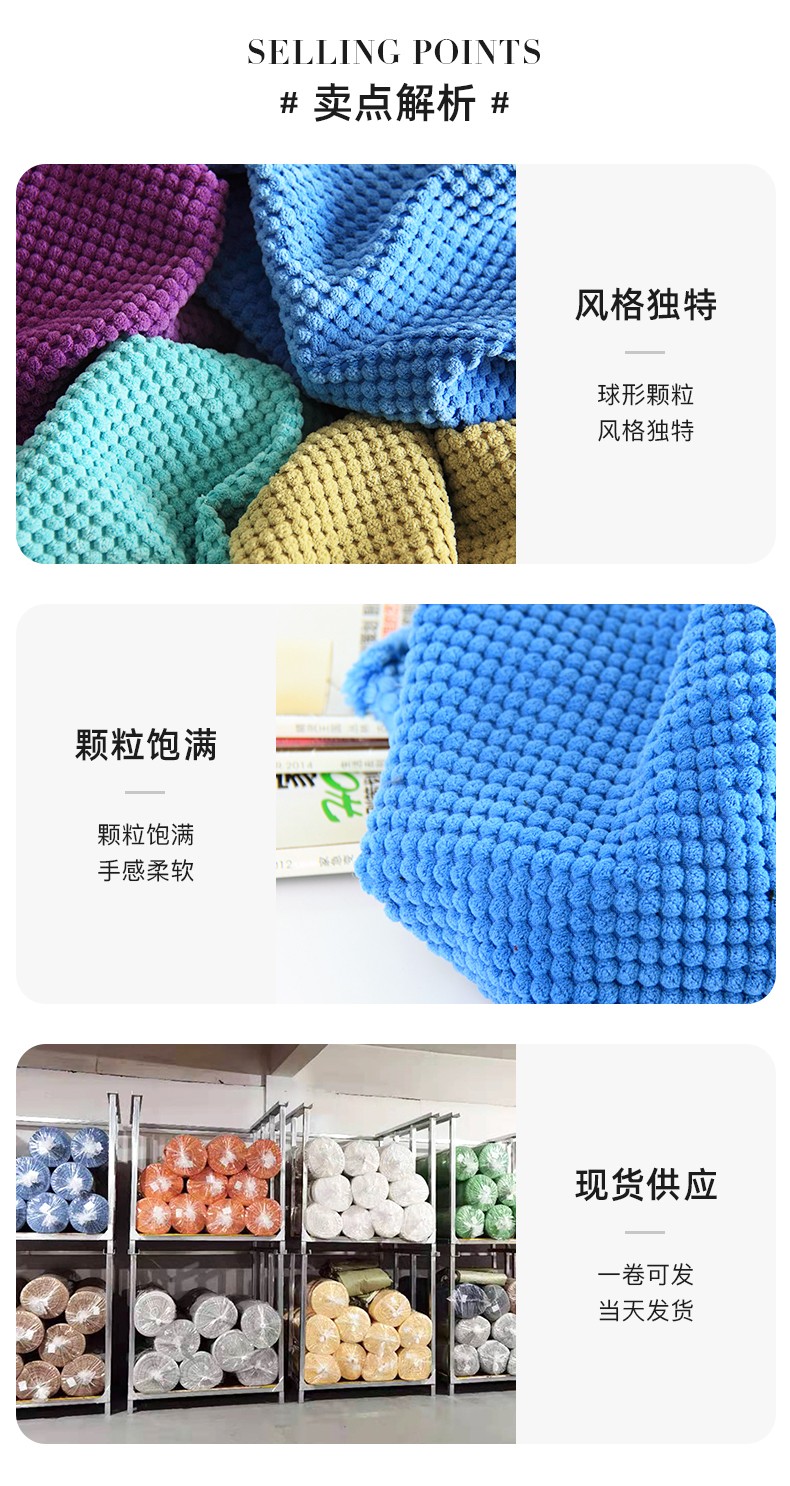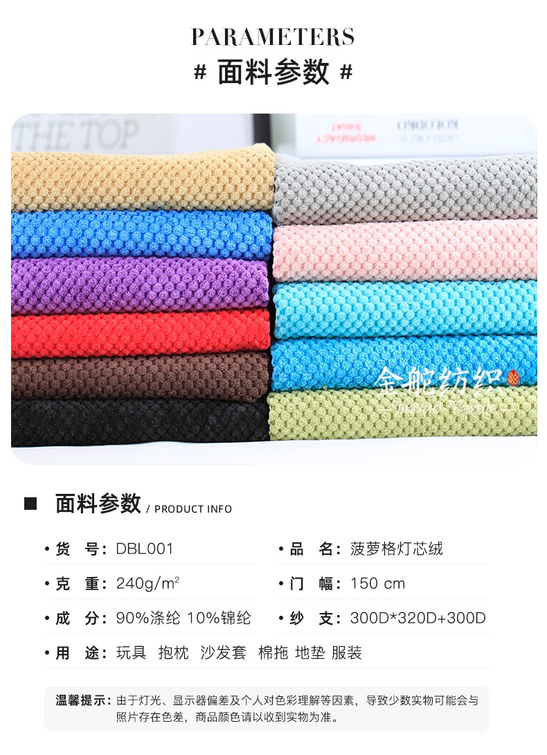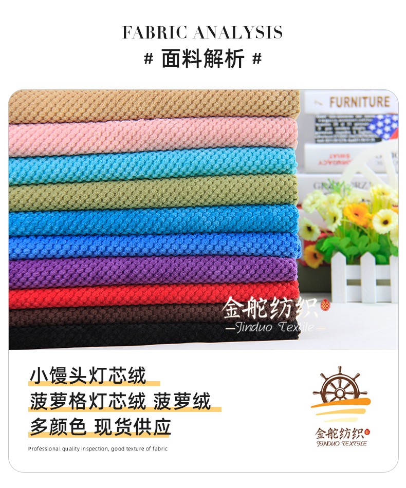 菠蘿格燈芯絨面料,優(yōu)質(zhì)滌錦復(fù)合絲織造而成,經(jīng)過開纖,染色,定型,梳毛等工藝流程,布面形成顆粒突起,緊密排列的效果,顆粒飽滿,手感柔軟, 舒適!因風(fēng)格獨特,布質(zhì)厚實而廣泛應(yīng)用于家紡,箱包,嬰幼兒產(chǎn)品,條絨玩具,汽車坐墊,地墊等領(lǐng)域!我司生產(chǎn)的燈芯絨產(chǎn)品均是環(huán)保染色,色牢度較好!可通過環(huán)保檢測,并有多色現(xiàn)貨供應(yīng),快速發(fā)貨!