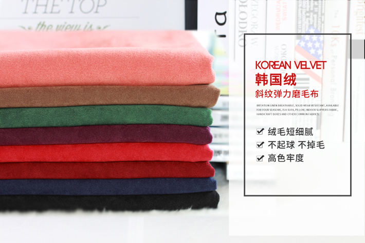 梭織韓國絨面料,滌綸斜紋彈力磨毛布,97%滌綸,3%氨綸,梭織韓國絨面料絨感短細(xì)膩,斜紋效果好,不掉毛,不起球,色牢度好,垂度好,優(yōu)質(zhì)的闊腿褲,半身裙,女裝風(fēng)衣時裝面料!