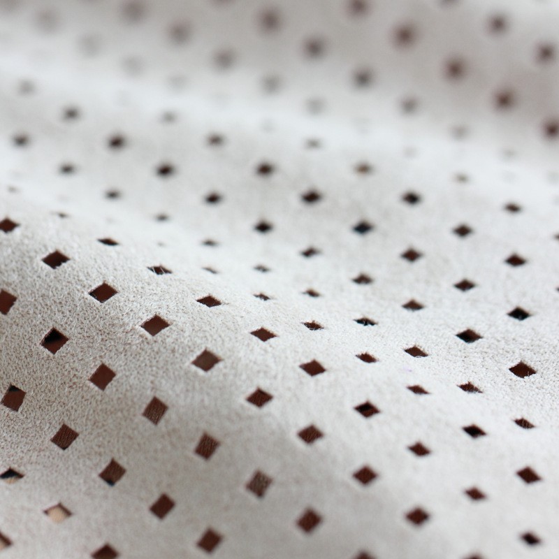 在服裝行業(yè),人們?cè)谧非髸r(shí)尚美觀的服裝造型的同時(shí),更加注重服裝功能性上的提高,即而出現(xiàn)記憶面料,竹纖維,牛奶纖維一些功能性的面料的出現(xiàn).可見(jiàn)人們對(duì)服飾,家居用品對(duì)人體健康重視程度越來(lái)越高,透氣性是人們對(duì)服飾最基礎(chǔ)的要求.沖孔是應(yīng)用機(jī)械模具對(duì)面料的沖壓而形成的穿透性,是從物理上對(duì)透氣性的提高.模具的多樣化可以為面料增加多樣化的花型,是時(shí)尚與科技的結(jié)合.沖孔麂皮絨集合了麂皮絨絨毛效果與透氣性功能,在服裝