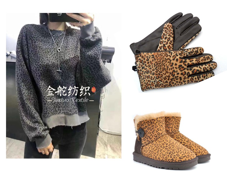2018年時尚動物紋強勢歸來,豹紋,蛇皮紋尤為突出,豹紋大衣,豹紋提包,豹紋衛(wèi)衣,豹紋短裙這些面積比較大的需要大的豹紋花型,而達到比例尺寸的協(xié)調(diào)美感,而手套,保暖緊身褲,小件單品,兒童服飾等則需要比較小的豹紋,所以開發(fā)了三四個小豹紋麂皮絨印花滿足市場需求。豹紋花型變化,演繹萬千,我公司也有其他豹紋,歡迎客戶提供花型定做!