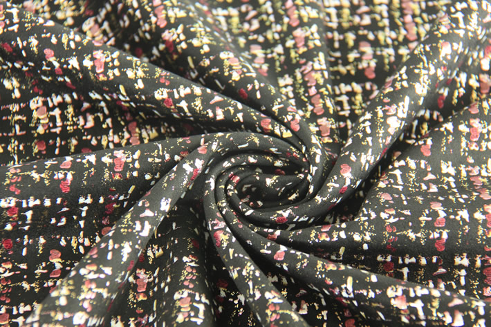 燙金麂皮絨布,該面料選用針織彈力空氣層麂皮絨為底布進行燙金工藝加工,七彩色膜配合不規(guī)則圓點花型,柔軟,保暖,厚實,可做復(fù)古麂皮絨旗袍連衣裙套裝