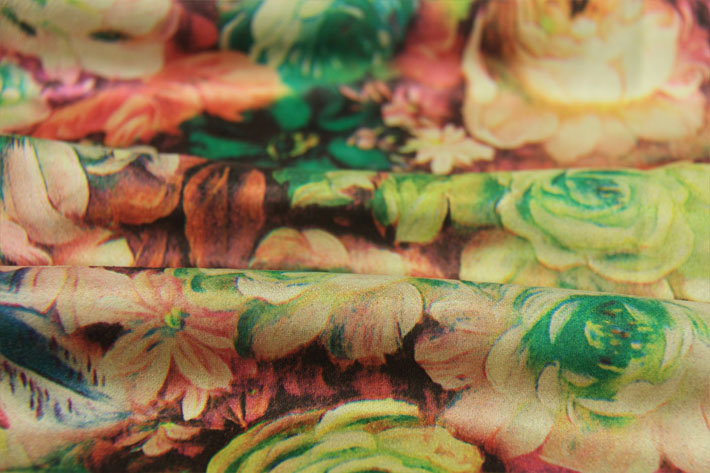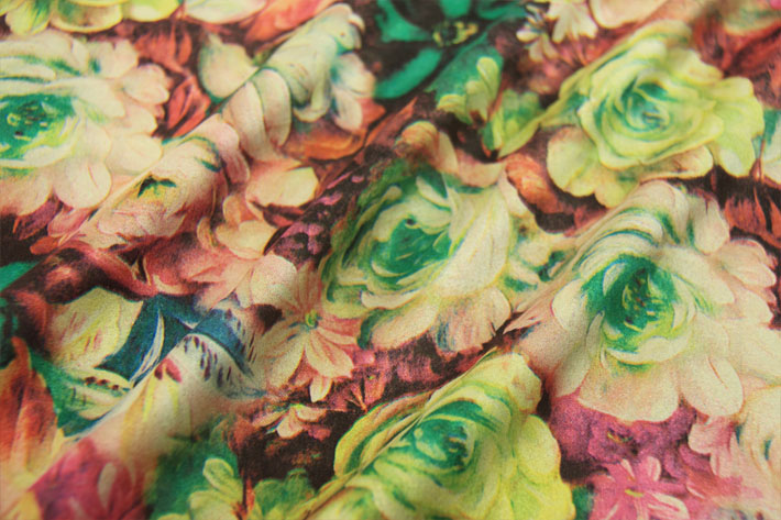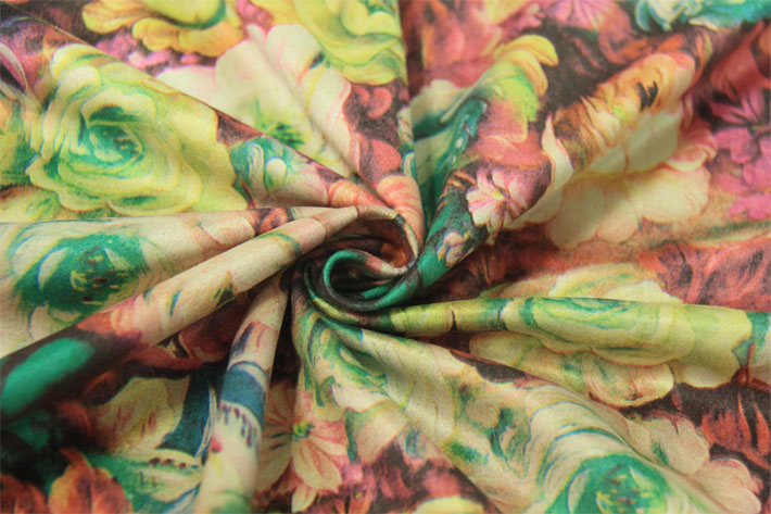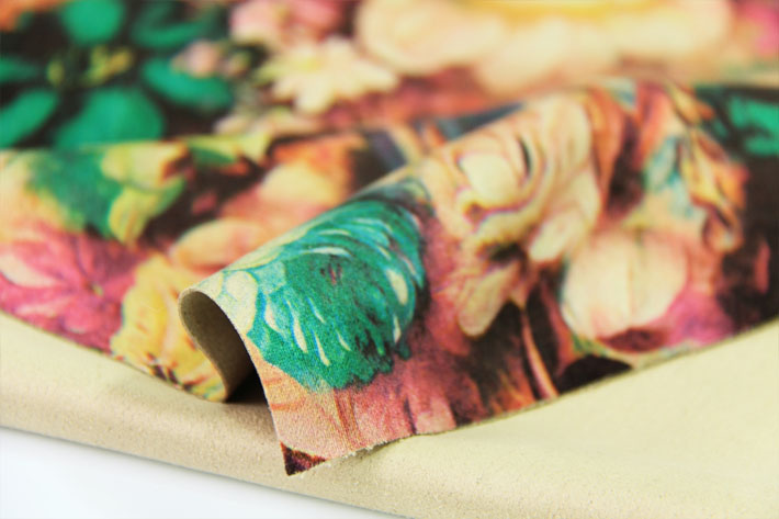該面料選用針織緯編麂皮絨,進(jìn)行數(shù)碼印花加工,植物花型,色彩鮮艷。