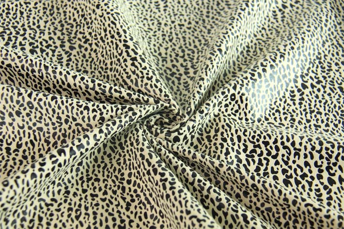 豹紋一直都是流行時(shí)尚元素,豹紋花型很多,多種多樣,形狀變化,色彩不同,大小變化等都成就了不同的豹紋。該面料亦是豹紋,花型形似腰果,故叫腰果豹紋,采用厚實(shí),耐磨的200D經(jīng)向麂皮絨為底布,進(jìn)行燙金工藝加工,耐磨,不變色,豹紋花型為無光皮膜效果,比印花效果更顯高檔,廣泛應(yīng)用于鞋靴,箱包等。
