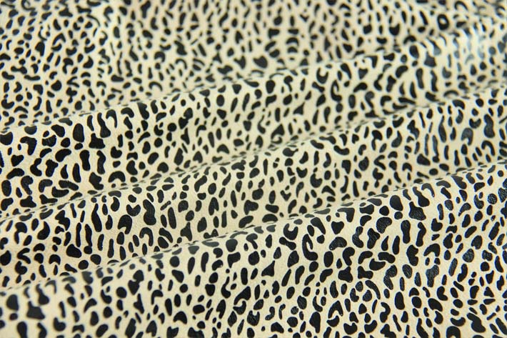 豹紋細(xì)節(jié),花型經(jīng)過燙金加工后,呈無光皮膜效果,耐磨不變色。
