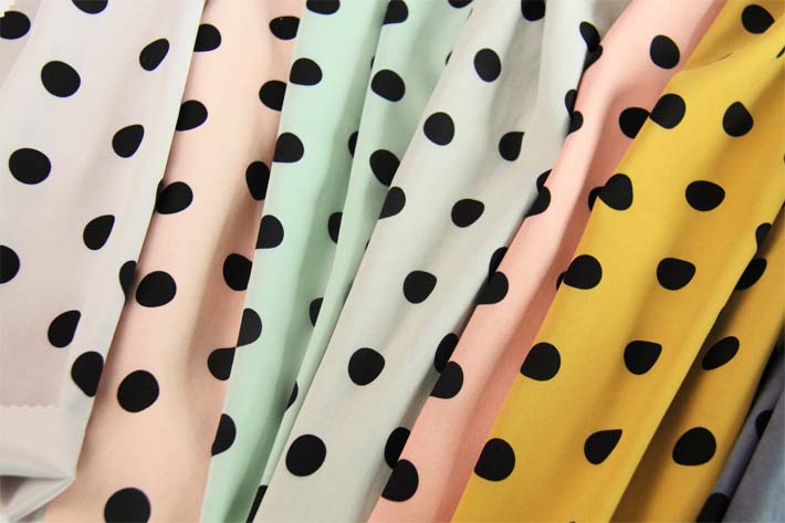 印花韓國(guó)絨,薄款,緞紋織物,微彈,輕薄,垂感好。最為流行的波點(diǎn)花型。